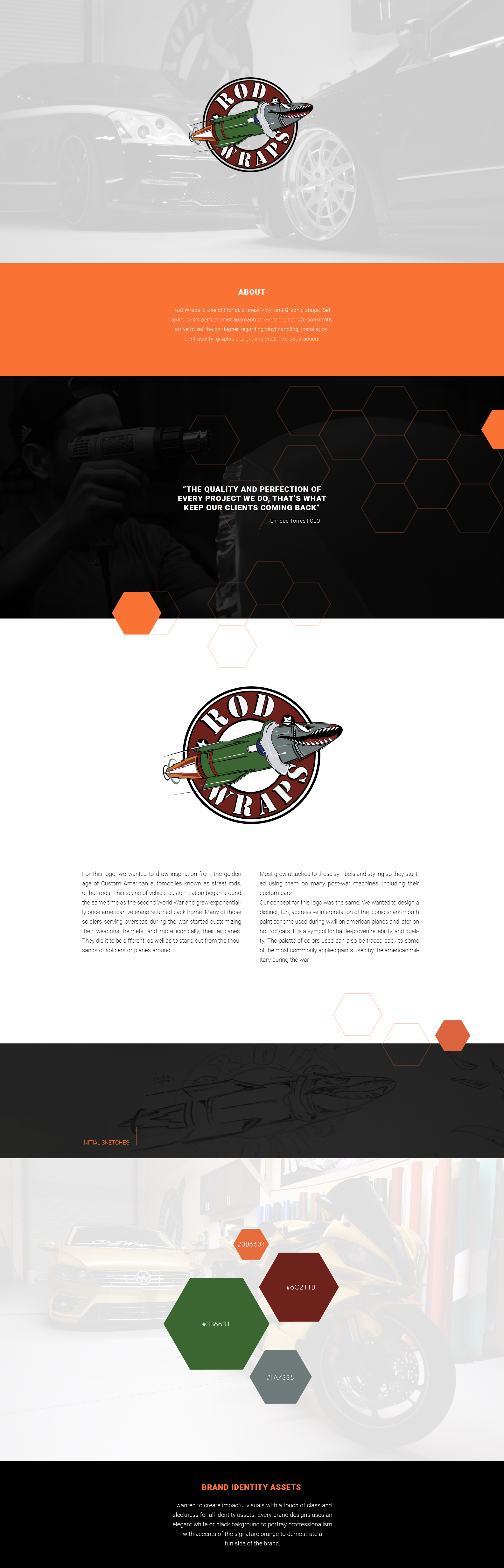 Brand Identity design for one of the most successful Florida Vinyl shops, Rod Wraps. Project consisted of Logo conception and illustration, Print media design, Web and social media marketing, Apparel Design, and Photography.